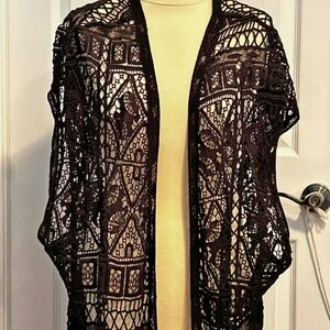 NEW PHOTOS! KIMONO, DUSTER, BLACK, SIZE 4X, ALLOVER FLORAL CROCHET, LONG FRINGE,