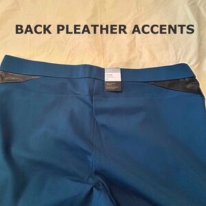 NEW PHOTOS! LEGGINGS, PLEATHER ACCENTS, SCARABE BLUE, SZ 26, VISCOSE NYLON, FAUX LEATHER ACCENTS, ELASTIC WAIST, MICHEL STUDIO for ADDITION ELLE, TAGS ON, NEW NEVER WORN