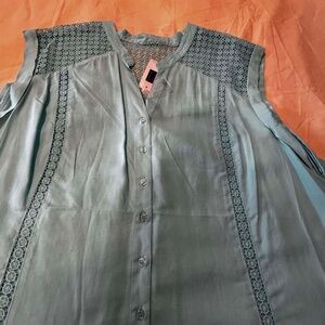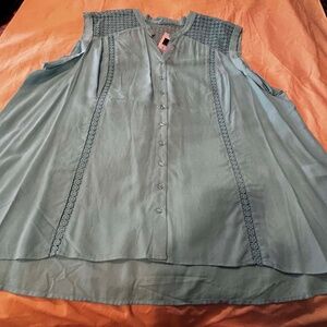 NEW PHOTOS! LINEN BLEND BLOUSE, BLUE RADIANCE, SIZE 24, GEOMETRIC LACE ON SHOULDERS & BACK, FAGOTTING INSERTS IN FRONT, SLEEVELESS, BUTTON FRONT, HIGH-LOW HEM, SIDE SLITS, BACK GATHER, MANDARIN COLLAR, ADDITION ELLE, TAG ON, NEVER WORN