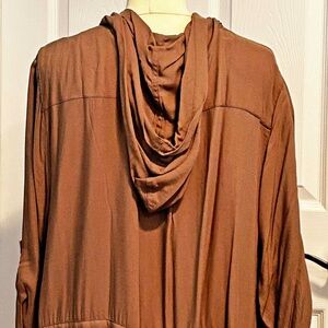 NEW PHOTOS! SAFARI JACKET, SOFT RAYON, TAUPE, SIZE 4X, ¾ SLEEVES, OPEN FRONT, WAIST DRAWSTRING, 2 POCKETS, HOOD, PENNINGTONS, IN ORIGINAL BAG, TAG ON, NEVER WORN, HAS TWO ⅛ in. HOLES IN HOOD