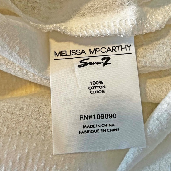NEW PHOTOS! ¾ SLEEVED BLOUSE, WHITE, SIZE 4X, TEXTURED 100% COTTON, WITH CUT-OUTS, ELASTIC CUFFS, VEE NECK, HIGH-LOW HEM, MELISSA McCARTHY SEVEN for ADDITION ELLE, IN ORIGINAL BAG, TAG ON, NEVER WORN
