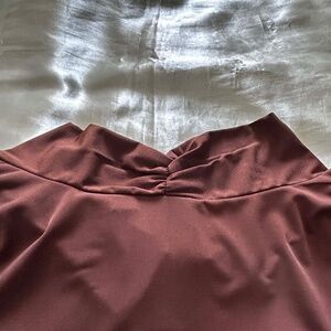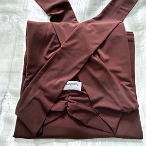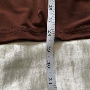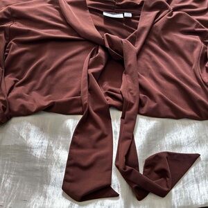 NEW PHOTOS! TIE NECK TOP, BROWN, SIZE 3X, PULL OVER, 3/4 SLEEVES, SPANDEX KNIT,