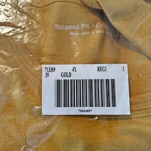 NEW PHOTOS! T-SHIRT, GOLD, SIZE 4X, SHORT SLEEVES, SIDE SPLITS, SCOOP NECK, LONG LENGTH, 3 SMALL DOTS, RELAXED FIT, ADDITION ELLE, IN ORIGINAL BAG, TAGS ON, NEVER WORN
