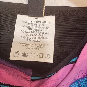 This vibrant tankini top only from Addition Elle showcases a striking ruched design in pink and blue on black background. It features adjustable straps that can be criss crossed, molded built-in cups, stretch and flattering silhouette. It is size 2X and new, without tags. It has never been worn or washed. Model photo generated by AI for general fit view only not actual swimsuit top.