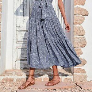 Pretty Garden Floral Print Boho Wrap Dress with Belt in Blue and white spotted print. Classic V-Neck Shows Collarbone with a hidden buckle design to avoid too much exposure of the chest. Leopard Print flowy fabric, cute split ruffle sleeves, high waist cut, removable belted elastic waist and Swing Flare Tiered Hem.