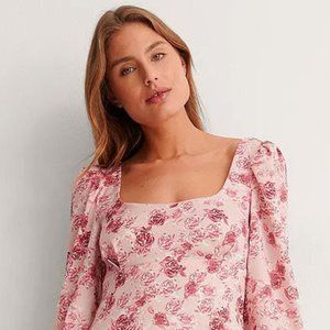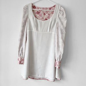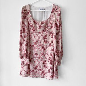 This sexy and cute dress is partially lined and features a round neckline, a fitted bodice, puffy long sleeves with button cuff, a side hidden zipper and a mini length. lining is in white. The color is pink tone with a some white, Rose Print.