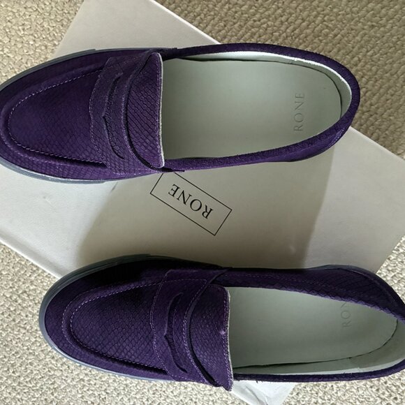 NEW in box. RONE Thirty-six Men's Loafers. Sz 11. Purple colour. Hand sewn python embossed suede upper. Calf footbed and liner. Handmade clear vulcanized construction. Clear rubber outsole. Check out the RONE website. Original price = $211. Check RONE website for more photos, details. https://www.ronebrand.com/products/thirty-six-purple?_pos=2&_sid=bd1969848&_ss=r&variant=32565299413080