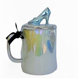 Brand new Rae Dunn ceramic Disney Princess Cinderella iridescent finish mug with iridescent blue glass slipper topper.