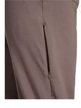 Reebok men's stretch performance pants in brown. Smooth fabric with slight sheen. Zippered side pocket and belt loops. Designed for comfort and casual wear.