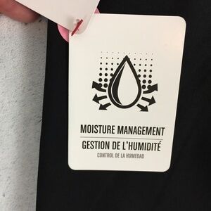 Women's Size Medium, Slim Fit. Front and back panels polyester/spandex blend. Built in underwear 100% polyester. Solid black front, Heather black back and waistband. Moisture wicking. Quick drying - could be worn for swimming. Pull on with wide, stretchy waistband. Reebok logo front leg, Reebok spell out silk screened in black on back of waistband.