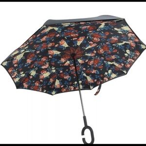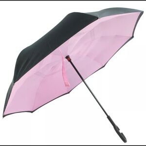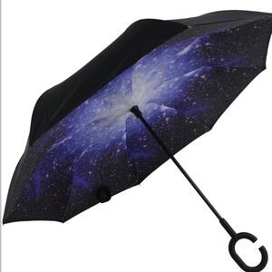 Reverso Reversible Umbrella close inside out and uses special reverse folding technology to capture all the wet rainwater "inside" the umbrella, which means no wet stains or wet clothes or dripping water inside your car, living room or elsewhere.There are 6 different color to choose from: Black, Pink, Blue Sky, Rose, Starry Sky and Blue Stripes. C-shaped handle for convenient hands-free use