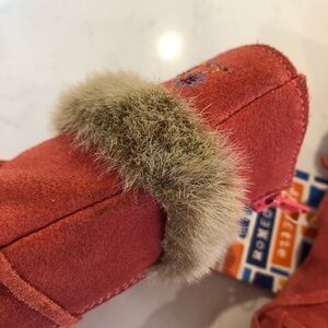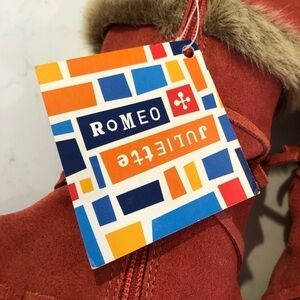 NEW WITH TAG Romeo Juliette Peach Cottage pink leather suede tall boots with a crisscross pattern design. Cute Inuit style! Super cute and cozy for the Fall and Winter! Accented with beautiful embroidered florals across the top and a tan furry rim. Threaded suede design along the foot line. Tan rubber textured soles and tall zipper for easy on and off. Approximately a 7" shaft. In excellent brand new condition with the only flaws being three areas with light stains from storage (see photos of me pointing to the areas in the last picture). Little Toddler Girl's size 7.