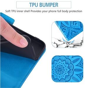 Blue phone case for a Samsung Galaxy A03 Core, featuring a textured mandala design AND a screen protector. Protect your phone with this elegant design.