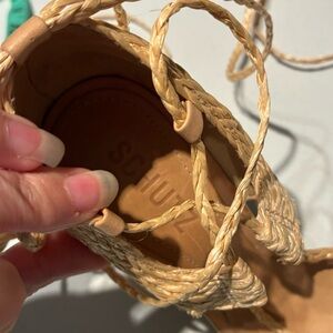 NEW (WITH STICKER ON BOTTOMS, no box) Schutz Heeled Sandal. Colour is a neutral natural beige in a braided raffia fabric and leather sole. Made in Brazil. These are the ultimate summer, vacation, coastal, euro summer getaway shoes that have a bohemian flare! Natural raffia fabric goes with many outfits in a neutral coastal colour. Heeled high sandal with lace up strappy detailing. Excellent new condition. Leather sole. Size 5.
