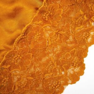 Taken from the boudoir, this slip dress combines lingerie accents with a scintillating hue. Cut from burnt orange satin, tie straps, lace trims and a side split in the skirt add sensual allure.
