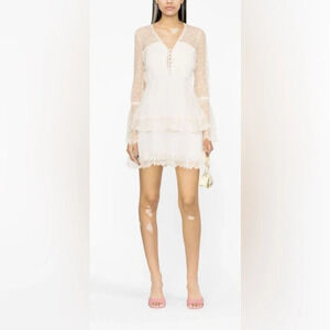 NEW Self-Portrait Chiffon Lace Tiered Mini Dress White Ivory | size UK 8 / US 4
