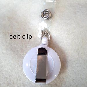 ♥ 360° spinning white plastic retractable ID badge reel with belt clip and clear plastic strap