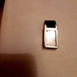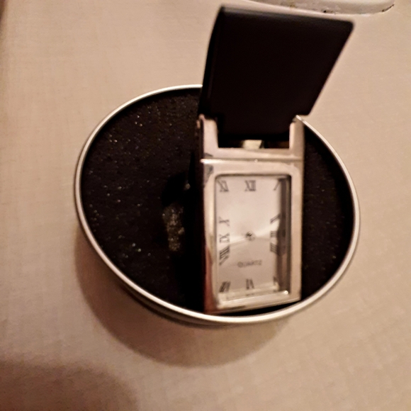 Elegant silver rectangular clip watch. Features Roman numerals and quartz movement. Needs new battery. NIB