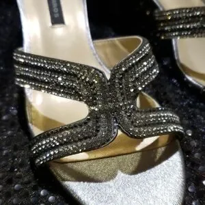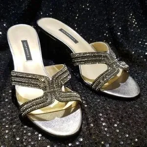 New without box. Comfortable slip on silver heels, clear/black rhinestones. 3" heel