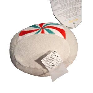 Nissa is an off-white Yeti with gold horns and a white fuzzy tuft of her on her head. Her belly is in the form of a peppermint swirl colored in red, white, and green. She has a white face with two black eyes and a black smile.