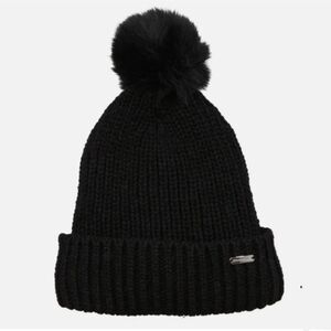 Black Ribbed Beanie features black faux fur pom pom