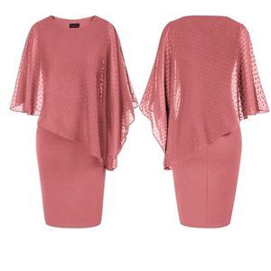 Plus size pencil dress features chiffon overlay, round neck, sleeveless with chiffon capelet design, hidden zipper on the side
