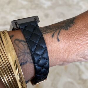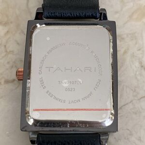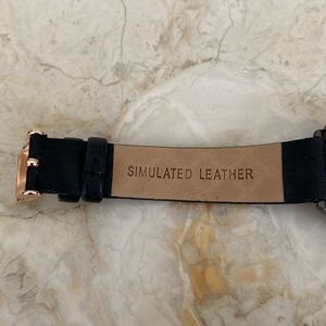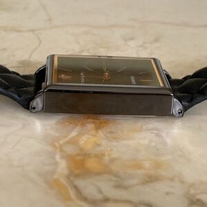 Good looking and never worn Tahari Quartz Watch. Elegant tank style, black and rose gold with a simulated leather strap.