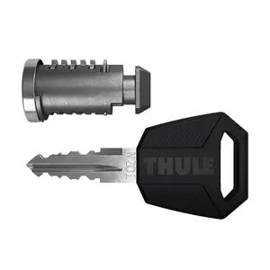 Thule lock cylinder with matching key. Sleek and durable design.