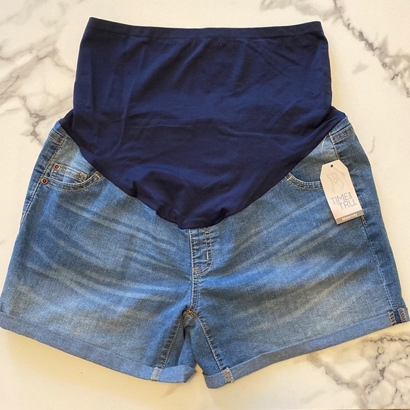 NEW Time & Tru Maternity Belly Band Rolled Cuff Stretch Light Denim Jean Shorts