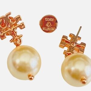 NEW Tory Burch Rose Gold T-Logo Swarovski Pearl Drop Earrings NWT $135