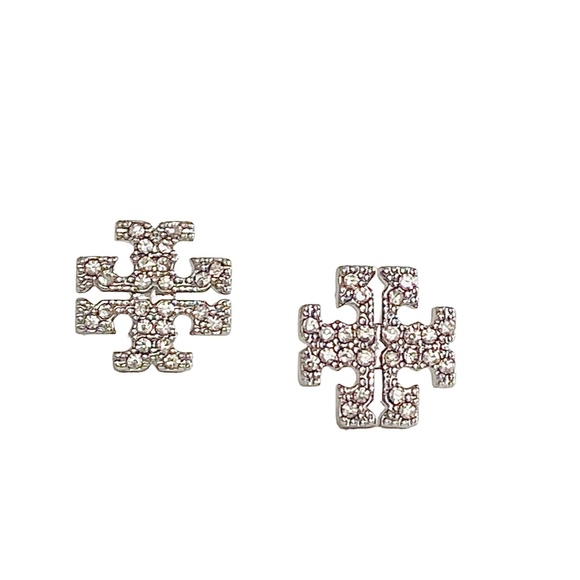 NEW Tory Burch Silver Small Logo Stud Earrings w Clear Pave Stones $131