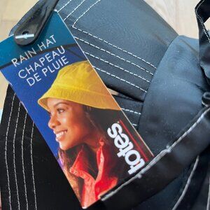 Rain hat from Totes with a cute ribbon on the back. Contrast white stitching. This is one size but I wouldn't recommend if you have larger head, it could be tight for you. Super cute rain hat ! New with tags.