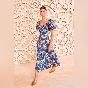 Embrace elegance with this stunning floral puff sleeve dress. The vibrant blue and orange hues create a captivating look. Perfect for any occasion.