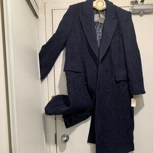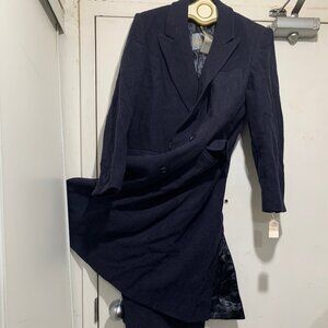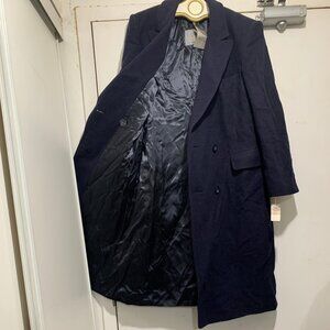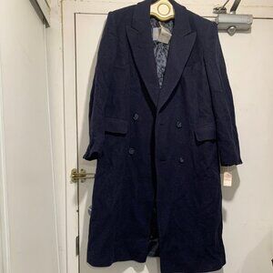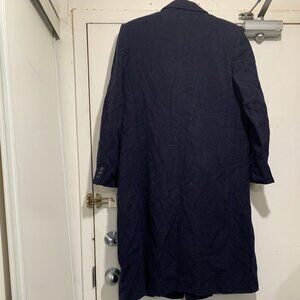 Aquascutum of London Double Breast Coat, Lightweight, Missing Size Tag, Fit Size L, Color Blue, 100% Wool, Lined, Front Pockets, Shoulder Pad, Back Vent, Closure Buttons, Good Condition, Brand New, Trench Coat, Made in Canada, Great Look, Great Fit.