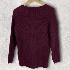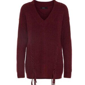 Vero Moda Glendora V-Neck Jumper Sweater in Winetasting and Women's Size Small. Chunky slouchy knit with v-neckline and lace-up detailing at the waist. Perfect peice to wear with leggings and over the knee boots. Made in Bangladesh. Machine washable. Brand new without tags! No flaws.