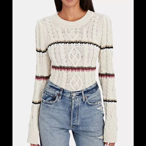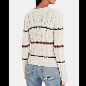 A stylishly relaxed cable-knit pullover in a soft, neutral base with playful multicolor stripes. Crafted for a modern, effortless look.