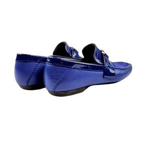 Blue suede on upper leather on sides and patent leather trimming with signature silver tone medusa's head. Rubber outsole. Like new in condition. Made in Italy.