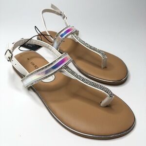NEW Via Rosa Holographic Silver Jewelled T-Strap Flat Diva Summer Sandals SIZE 6