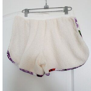 Fuzzy sheep-like shorts, one side has pockets that's lining matches the sweater