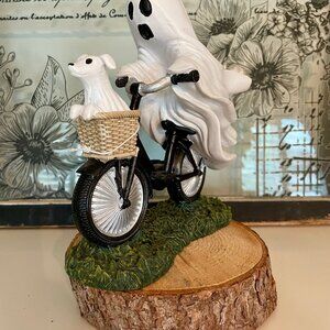 Super cute and physically fit ghoul! Ghost is riding his bike with a happy dog in the basket. Measures about 9" long and about 8" tall. Polyresin.