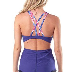 The Goddess Top from PopFlex Active brings divine style to the gym with an elegant drape that flatters your figure - purple hued Navy color, high-cut neckline, contrasting criss crossed straps in back, and a cutout design.