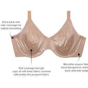 Full coverage two-ply cups of soft inner fabric covered with pretty dot jacquard fabric with accent sheen