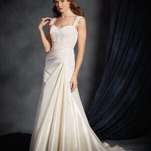 Pictures definitely don't this beautiful Moderen Mikado gown justice! Straps can be worn off-the-shoulder if desired (will need altering for length), This super sexy, sophisticated fit and flare bridal gown that just hugs the curves in all of the right places and has a plunging neckline and gorgeous corset back! Super Flattering! More pics to follow.