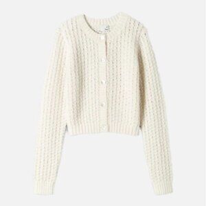 This is a cropped, button-up cardigan with shell buttons and a slim fit. It's knit from a cozy alpaca-blend yarn.