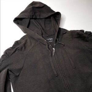 New York & Company full zipup hoodie in a chocolate brown color w pockets & a drawstring hood. The sleeves are ruched and so beautiful on. Stretchy and comfy! In excellent condition as far as the material goes as I only wore it once. However the only flaw is that it has some discoloration throughout (almost like faded areas). Please see photos. It’s much harder to see those areas in real life. It is much more magnified in the photos. Price reflects flaw. Great for a bleach DIY project. Women’s size SMALL.