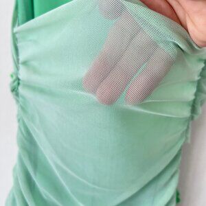 Chic and sexy, this ZARA Tulle Ruched Mini Dress features a stunning blend of two green tones (pale mint green). The delicate tulle mesh fabric creates an ethereal look, while the ruched chiffon underdress adds texture, accentuating the dress's figure-flattering silhouette. Perfect for making a bold yet elegant statement, this mini dress combines modern style with a touch of playful allure.