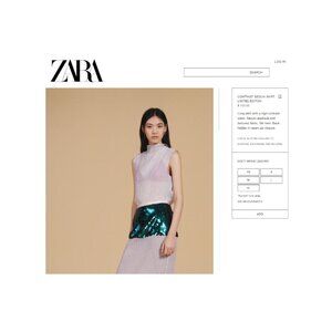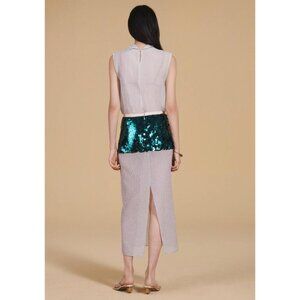 Long skirt with a high contrast waist. Sequin appliqué and textured fabric. Slit hem. Back hidden in-seam zip closure. Sheer.