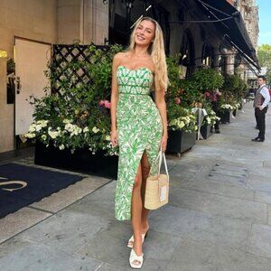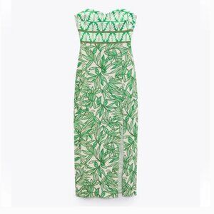 Gorgeous Zara strapless midi dress made from a linen blend fabric with a tropical print in green and ecru.
