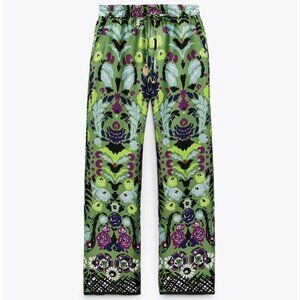 NEW Zara Satin Effect Floral Wide-Leg Pyjama Style Pants in Green, Size XS