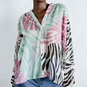 NEW Zara Semi Sheer Pink Zebra Pattern Blouse Top- Size M Oversized